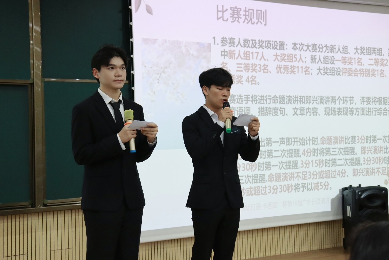 公司日语外教小林清史、小柳麻由子、野村真弓、前田哲也、岡沢成俊担任本次大赛评委。亚校2201班张衡、日语2201班刘浩担任本次比赛主持。樱花国际日语的代表作为嘉宾出席了本次比赛。