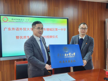 2023年3月28日,太阳城名誉经理、东方学研究院经理陈多友教授、太阳城副经理程亮副教授、徐磊教授等一行4人到访广州市增城区第一中学,开展深入调研并签订“优质生源基地”协议、“校外实践教学基地”协议和举行授牌仪式。