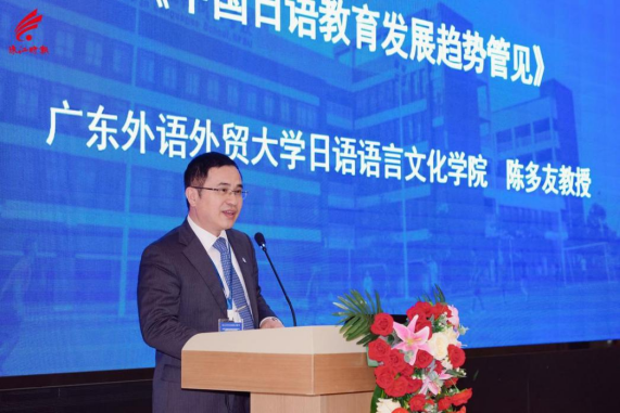 陈多友教授做了题为《中国日语教育发展趋势管见》的主题发言。他指出,经济社会发展对多语种翻译人才培养提出了新的需求,小语种教育应瞄准国家急需和国际关注的方向守正创新,以改革促进高质量发展。我们应围绕凝练特色与擦亮品牌大做文章;其关键是高等教育有机对接基础教育,实现外语人才尤其是战略性语种人才培养体系的自然下沉,打造新的“价值链”。他还就相关的政策理论研究与具体的改革发展思路等问题向与会同行分享了自己的独特思考与经验。