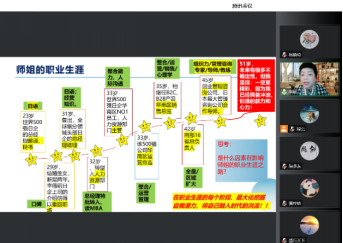 连广宇女士事先对公司员工的职业规划状况进行了摸底调查,从员工的职业规划困惑引出讲座主题,并分享了自己的职业生涯历程。她认为,进入职场以后的每个阶段,都应该最大程度地挖掘个人潜力,将自己融入时代的洪流。此外,她还向同学们介绍了职业探索期以及职业前、中、晚期不同的学习重点,并着重介绍了职业规划的三要素,强调应该通过了解个人的内在世界与外部世界做出行动,将自己置于最恰当的位置。连女士的指导与分享富有趣味,既结合理论介绍了人格六角形模型、可迁移与自我管理技能等策略,又联系实际分享了促进职业发展的一些具体方法,并对同学们的疑问进行了解答。