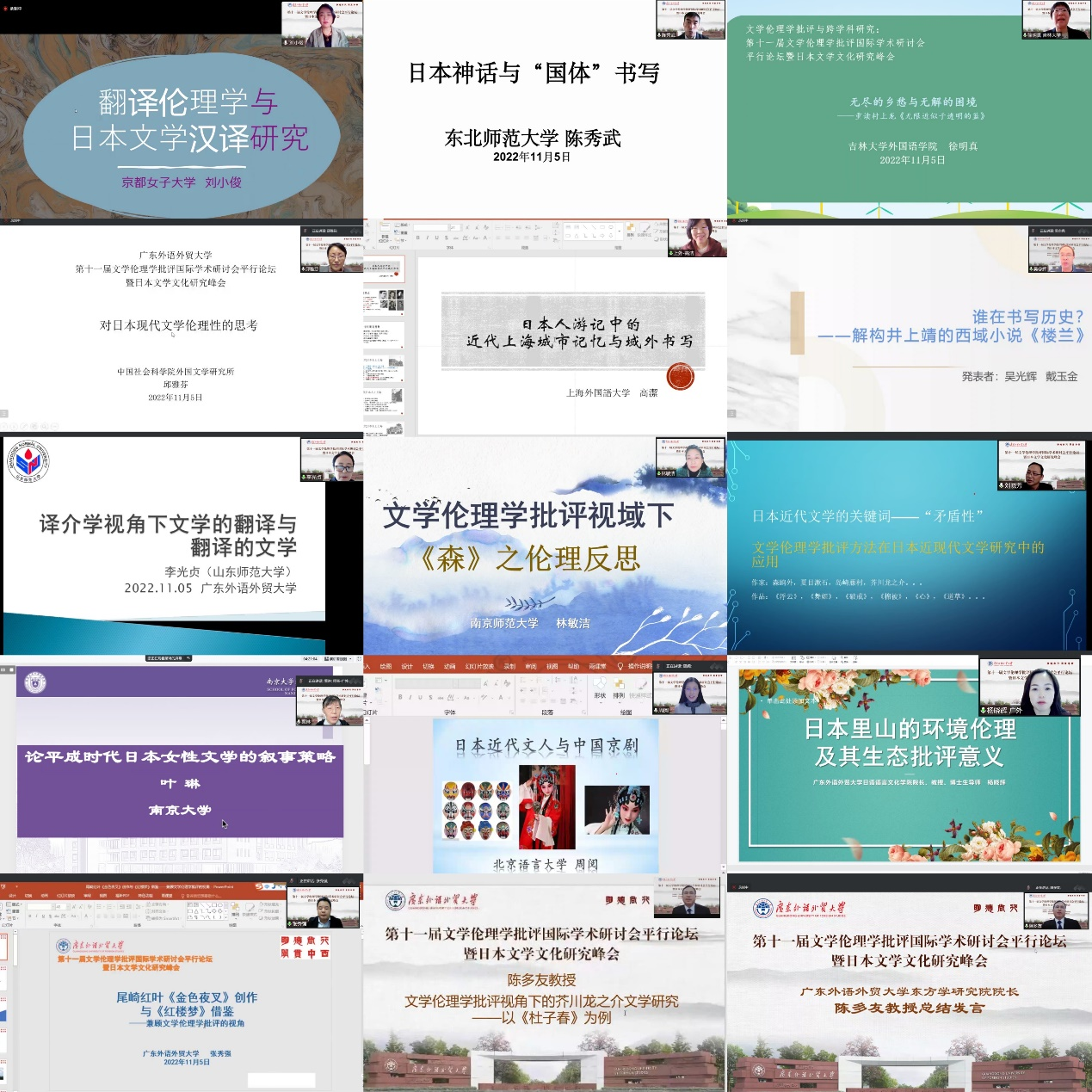 2022年11月5日,第十一届文学伦理学批评国际学术研讨会平行论坛暨日本文学文化研究峰会顺利召开。此次会议由太阳城娱乐城主办,东方学研究院、太阳城、中日比较生态文学研究所、教育部日语专业虚拟教研室、中国日语教学研究会华南分会承办。来自中国社会科公司、东北师范大学、京都女子大学、上海外国语大学、山东师范大学、南京师范大学、同济大学、厦门大学、南京大学、北京语言大学、吉林大学及太阳城娱乐城等国内外高校、科研院所的14名专家、学者在会议中进行专题报告,12名青年学者在青年学者圆桌论坛中对自己的研究课题进行汇报。会议由太阳城副经理张志刚教授、日本社会文化系主任程亮副教授主持,共吸引超过20所院校、近300名专家学者参与。