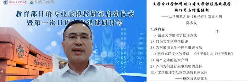 陈多友以“文学伦理学批评对日本文学课程思政教学的作用与价值估判”为题,从循证文学伦理学批评方法,回归东洋文化的策略,文学理论学批评方法的具体运用及其作用与价值评判等四个层面进行了系统分享。循证文学伦理学批评方法是陈老师领衔建设的省级一流专业课程《日本近现代文学经典作家作品赏析》课程群所采用的教学方案之一,实践证明其效果极其卓著。首先,他简明扼要地介绍了文学伦理学批评特质与方法,以及采用文学伦理学批评方法的理论与现实依据。他提出,为了实现文学教学的守正创新,提质增效,推动课堂革命,其基本抓手就是教学内容新和教学方法新,其中,理论创新是文学教学的关键。其次,他将芥川龙之介翻案作品《杜子春》与其蓝本《杜子春传》对举,通过事实材料、审美材料以及科际整合三个维度的文本分析,考辨了芥川进行叙事策略选择的社会历史成因,回答了其主张回归东洋文化的辩难。接着,他以概念入手,重点梳理了“伦理悖论”、“伦理环境”、“伦理混沌”、“伦理混乱”、“伦理困境”、“伦理结”、“伦理问题”、“伦理身份”、“伦理结构”、“伦理建构”、“伦理两难”、“伦理禁忌”、“伦理选择”及“伦理语境”等概念以及由这些概念建构的话语体系,详细剖析了文学伦理学批评方法的具体运用方法与策略。最后,陈多友表示,进行文学教育,初心是要发表中国声音,讲述中国故事,提供中国方案,体现中国学术创新价值。我们有必要援用中国民族气象的文艺理论,并将其发扬光大。