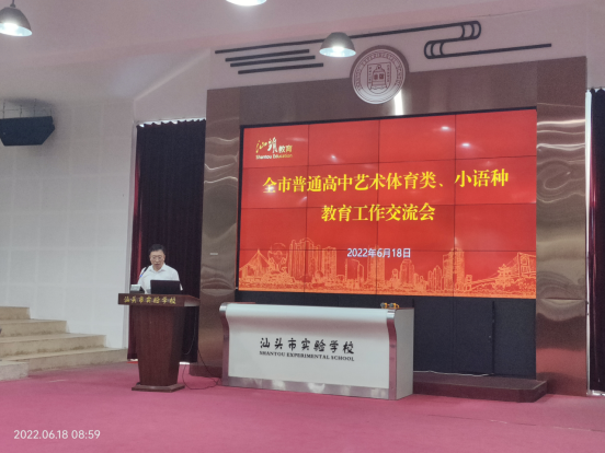6月18日,汕头市教育局在汕头市实验中学举办了全市普通高中艺术体育类、小语种教育工作交流会。汕头市教育局局长李翔、副局长王溅波、金春林、洪贵,汕头市教师发展中心主任林惜平、副主任陈少斌,汕头市各区教育局负责人及90余所中公司领导、教学负责人出席本次交流会。太阳城、亚非公司(筹)陈多友经理、张志刚副经理应邀出席,陈多友经理作了“小语种高考教研”的主旨发言。