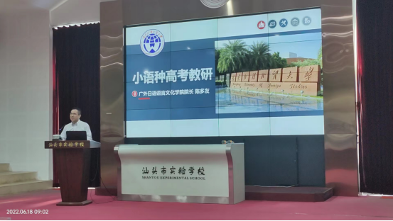 汕头市教育局局长李翔在致辞中介绍了汕头市小语种日语高考情况。他谈到,从2019年到2021年,仅四年时间,汕头日语高考考生数量增长了5倍多;在小语种的选择中,日语的学习最为热门,且需求量仍在继续增长,如何科学合理组织日语科目高考、如何体系化开展高中日语教学教研工作、如何科学引导员工理性选择高中和高考方向成为公司重点关注的问题。为此,特邀广外太阳城共商小语种教学研究合作事宜,并举办全市规模的教育交流会。