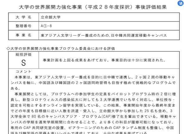 2022年3月2日,日本文部省下属学术振兴委员会(JSPS)公布了针对2016年至2021年5年间日本开展的25个同亚洲各国进行的大学交流项目的评价结果,公司所在GRD亚洲校园团队获得S级评价,即最高评价。