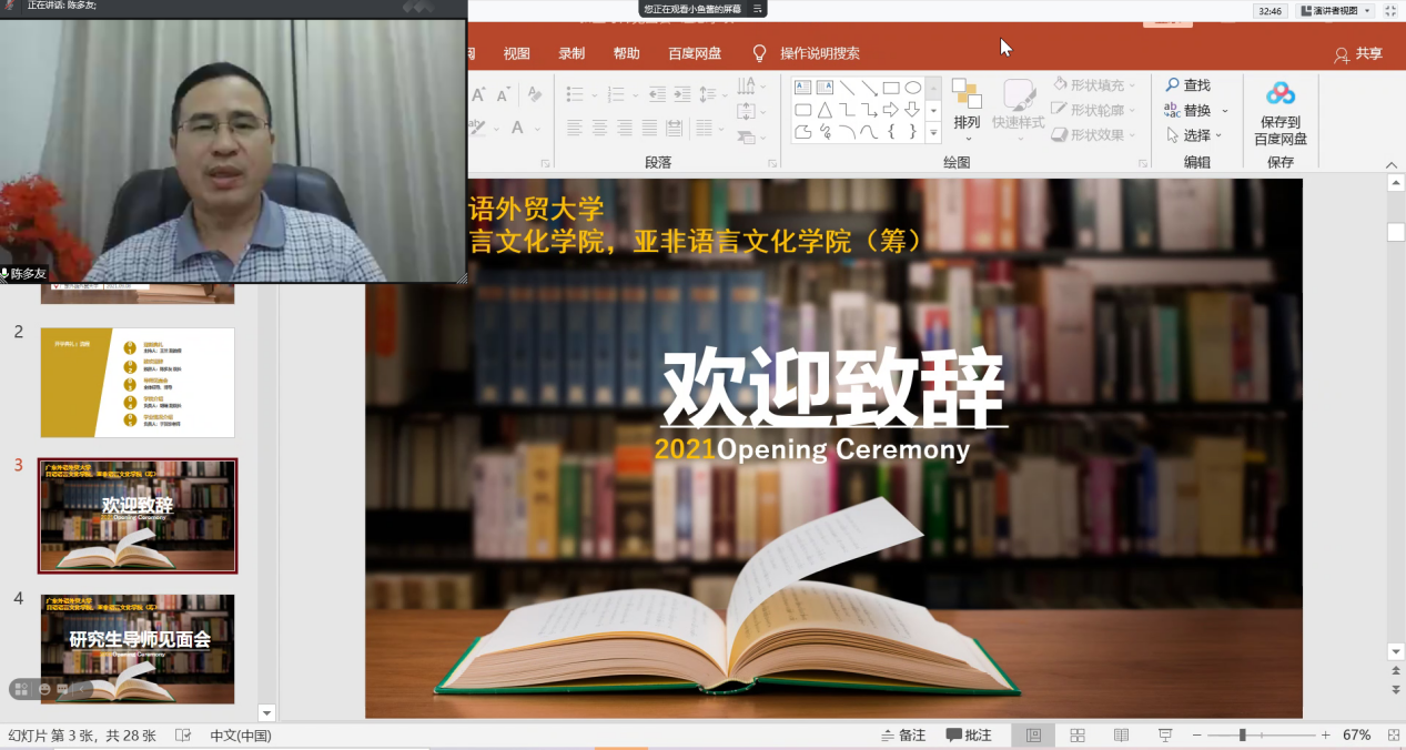 经理陈多友教授首先对2021级研究生新生的加入表示欢迎,希望新生们把日语、亚非公司当做自己的家。同时在疫情防控常态下,陈经理也对同学们的防疫意识提出了要求,叮嘱同学们在忙于学业的同时,要多关注自己的健康情况。