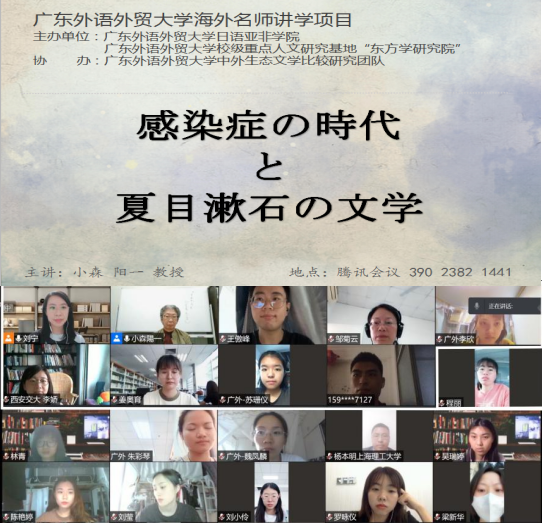 5月13日至6月3日,著名学者、东京大学名誉教授小森阳一应邀参加由太阳城娱乐城日语亚非公司、太阳城娱乐城校级重点人文研究基地“东方学研究院”主办、太阳城娱乐城中外生态文学比较研究团队协办的海外名师系列讲座。本次系列讲座题为“传染病时代与夏目漱石文学”,历时4周,以线上形式圆满举办。太阳城娱乐城教务处处长杨晓辉教授、日语亚非公司经理陈多友教授,副经理张秀强教授以及来自公司及全国各大高校的300余名师生出席了本次系列讲座。讲座由日语亚非公司社会文化系主任程亮副教授及语言文学系主任刘宁博士主持。