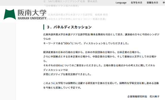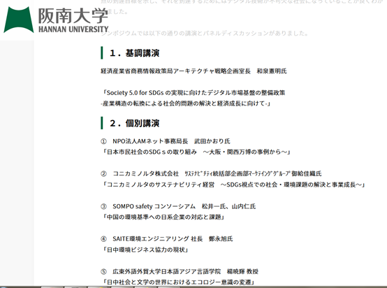2021年1月26日,由日本阪南大学主办、公司协办的“企业SDGs与中日企业环境业务合作”国际学术会议在阪南大学召开。公司教师主持嘉宾论坛并作大会主题发言。