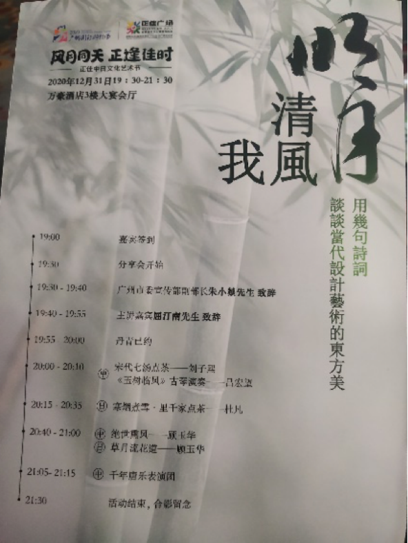 此次分享会是第九届广州国际购物节正佳中日文化艺术节的系列活动之一,当晚以“明月·清风·我”为主题,邀请到原广州市副市长陈倚倚,广州市委宣传部副部长朱小燚,广州市委宣传部对外宣传与新闻发布处处长龚艳华等多位领导以及来自本地设计界、文旅届的嘉宾莅临现场,聆听及畅谈诗词中的当代设计艺术之东方美。