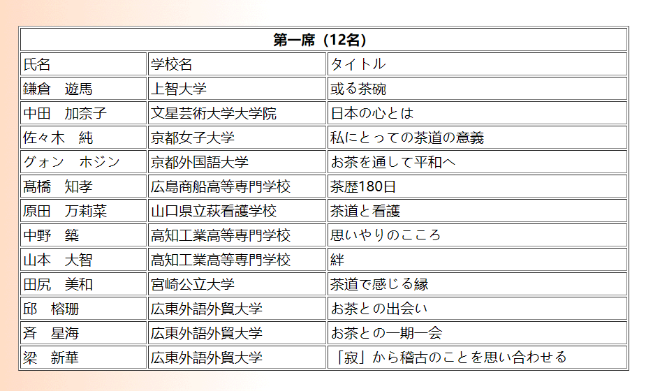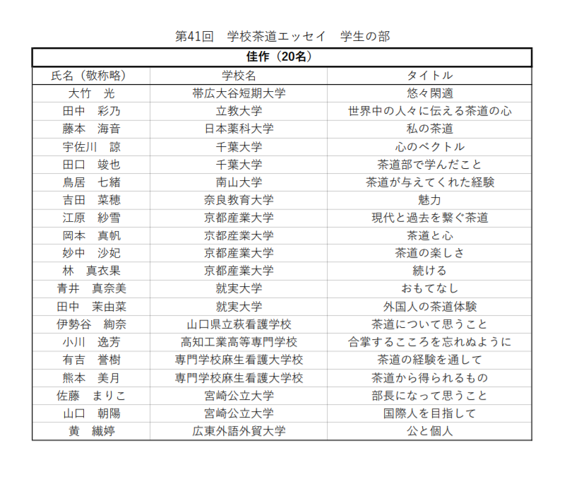在2019年日本茶道征文比赛中,公司太阳城16级邱榕珊同学——《お茶との出会い》(译:《我与茶道的相遇》)、17级梁新华同学——《「寂」から稽古のことを思い合わせる》(译:《从“寂”联想茶道修习》)、17级齐星海同学——《お茶との一期一会》(译:《与茶的一期一会》),以上三位同学喜获第一席(即二等奖),17级黄纤婷同学——《公と個人》(译:《公与私》)喜获佳作奖(即三等奖)。