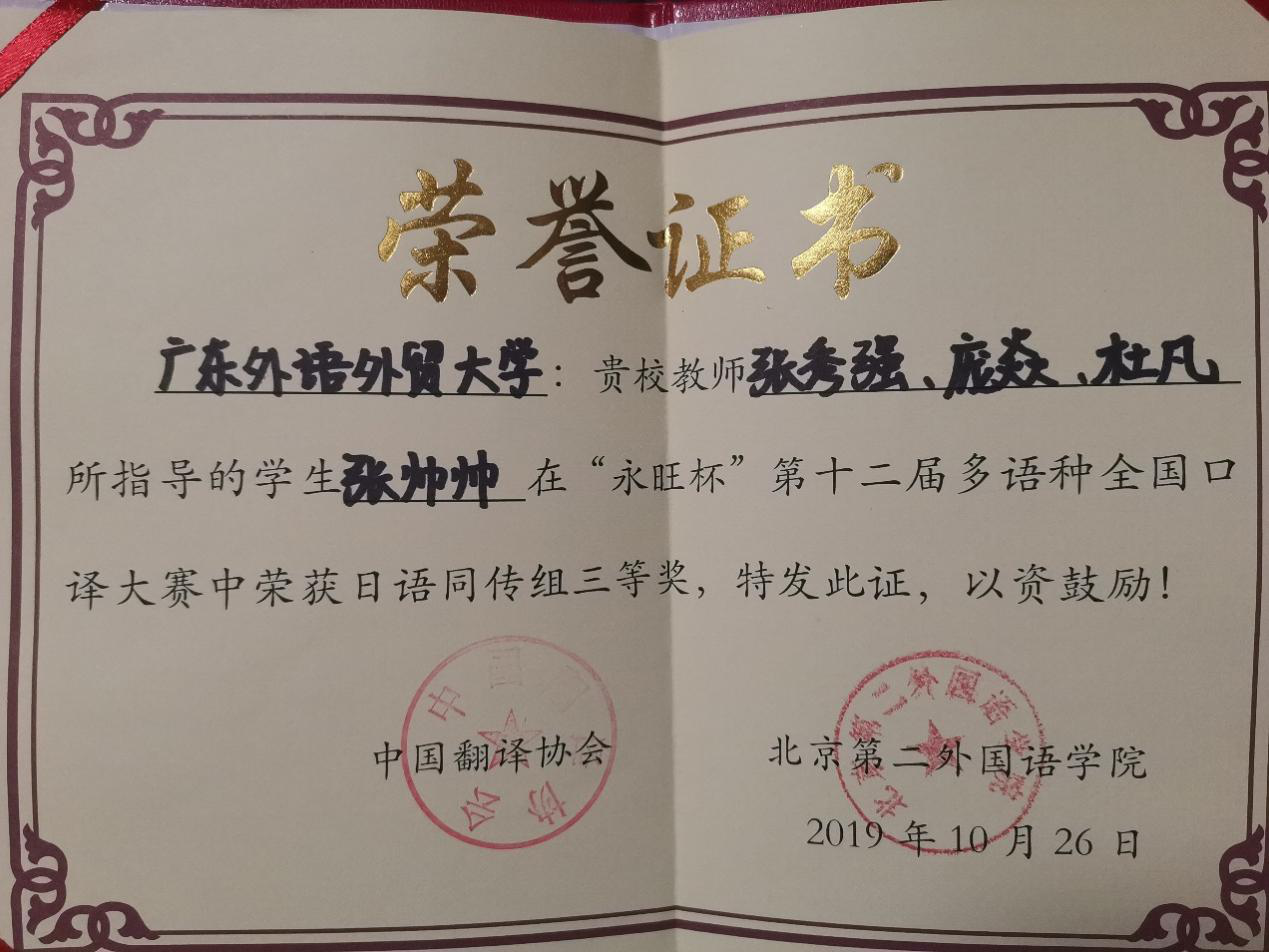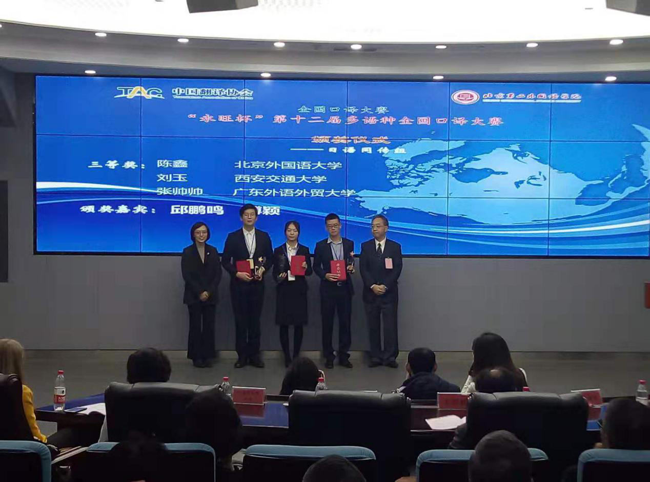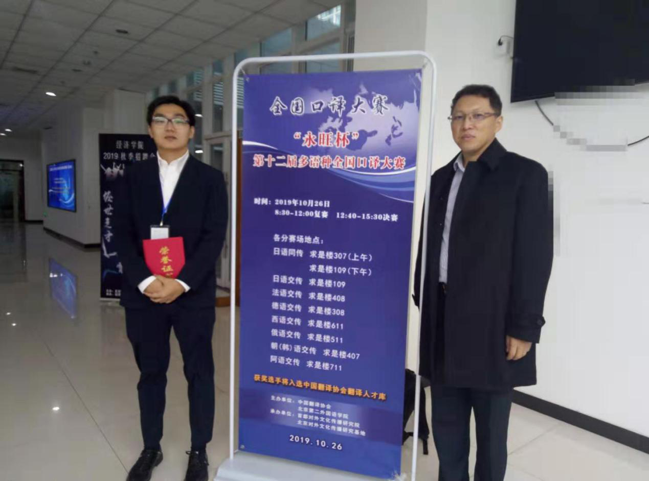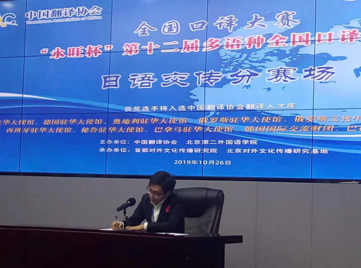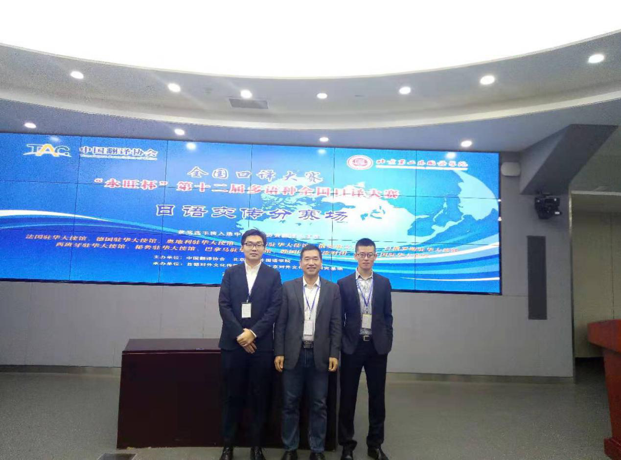 2019年10月26日,由中国翻译协会、北京第二外国语公司主办的“永旺杯”第十二届多语种全国口译大赛在北京第二外语国公司举行。本次大赛规格高,专业性强,经过赛前的网络初赛,从全国参赛选手中最终遴选出来自46所高校的107名选手进入复赛。公司2019级日语口译翻译硕士张帅帅同学和2018级日语翻译硕士李京伦同学代表公司分别参加了日语同声传译组和交替传译组的比赛,并双双入围决赛。经过激烈的角逐,最终张帅帅同学获得日语同传组三等奖,李京伦同学获得日语交传组优秀奖。张秀强、庞焱、杜凡、刘先飞等四位老师获得优秀指导教师奖。
