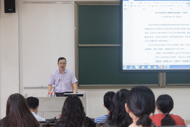 首先,陈多友经理就“关于日本近代文学研究方法论的一个讨论”这一主题,从现代性批评的角度解读明治初期代表性作家与作品,分析日本在摄取西方近代思想文化过程中所经历的曲折与困境,指出自明治时代起,日本知识人群中就发生了对近代性体验的质疑,甚至长期存在着反现代性、反西方化的思想、哲学等层面的抗争,这也构成了日本近代文学展开的一种美学特征。讲座中,陈多友教授指出,日本的“现代性”早在江户时代就已经萌芽,明治时代才真正全面展开,主要从四个方面做了全面的诠释:对基本人权的明确感悟;自我意识、个人主义的觉醒;资本主义各要素发生效用;民族、国民觉悟快速强化,以至于覆盖了社会整体。讲座将高屋建瓴的学术知识融入到了大量的实例中,内容张弛有度,引人入胜,引起了在座师生的共鸣。