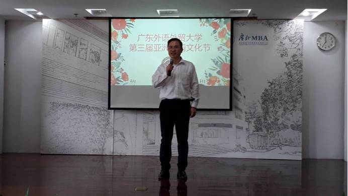 本网讯 5月26日上午10点,一年一度的亚校文化祭在广外MBA教学楼举行。文化祭是亚洲校园特有的活动,旨在增进三国师生的情感,促进文化交流。出席本次文化祭的有东方语言文化公司经理陈多友教授以及亚洲校园中日韩三国师生。陈多友在文化祭上致辞,寄语亚校,希望亚校师生要紧密团结,在学风、教风方面发挥引领作用,在教学、科研、员工活动方面不断进取,体现亚校精神。