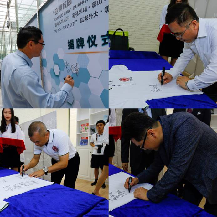 会后,教务处处长袁长青、东方语言文化公司经理陈多友、广州奥绅文化传播有限公司总经理李宇、韩国蔚山大学国际交流部部长具峰载、亚洲校园教育中心主任杨晓辉等共同为实习基地揭牌。