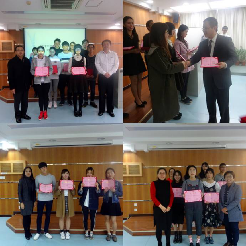 之后嘉宾刘晓芳教授、陈多友经理、杨晓辉主任、专任教师及日韩外教分别为16级、17级员工及日韩职工等首届亚洲校园语言综合技能大赛获奖同学颁奖。