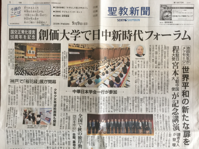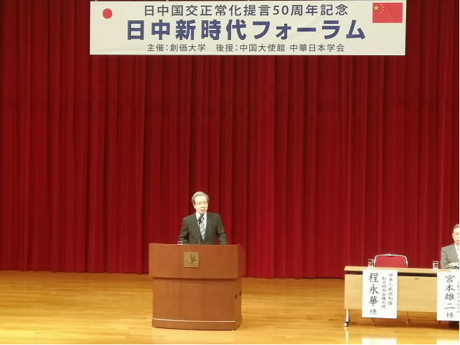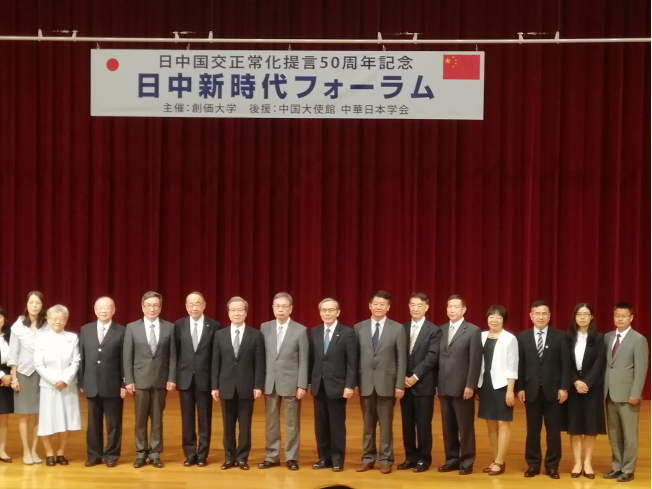 本网讯:9月8日,应日本国创价学会暨创价大学邀请,中国中华日本学会代表团一行15人访日,并出席中日邦交正常化倡言50周年纪念大会——中日新时代论坛。当日上午10时大会在创价大学本部大楼国际会议厅拉开序幕。开幕式上,代表团团长中国社会科公司日本研究所所长、全国政协委员高洪研究员,创价大学董事长马场善久教授,中国社会科公司日本研究所党委书记刘玉宏研究员分别致辞。复旦大学原党委副书记王荣华教授、东日本国际大学客座研究员西园寺一晃教授、北京大学日本研究中心贾蕙萱教授以及创价大学和平问题研究所玉井秀树教授分别作基调演讲。论坛由创价大学主办,中华人民共和国驻日本国大使馆与中华日本学会为指导单位。来自中日两国高校及研究机构的150余名学者与会。