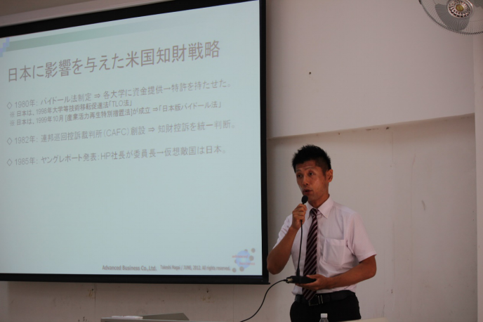 讲座开始,永井武先生表明,自己专攻知识产权中的专利权,在日语中称为“特许权”。他引用中国经济网公布的2012年中国知识产权指数报告,指出中国国内的知识产权综合能力前三位分别为北京、上海、广东。他说,知识产权综合能力与经济成正比,具有极大相关性。