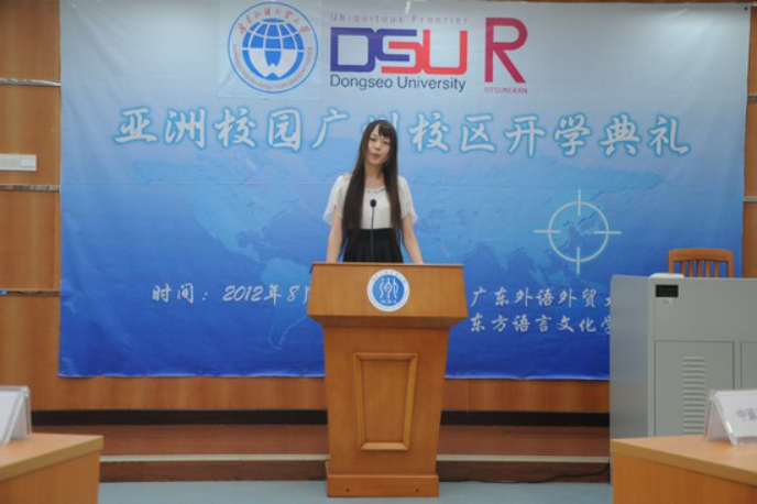 最后,公司日语系一年级的本科生王琦睿作为员工代表上台发表感言。她表示自己对母校能够顺利入选亚洲校园项目感到由衷的自傲,并表明了自己要努力学习,迎接挑战,并且和日韩的同学们一道为中日韩三国的友好关系不断做贡献的决心。