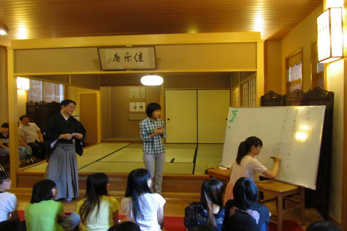 活动最后部分,安田登先生还安排了一个类似游戏的互动环节。他让在场的学子随意写下五个或七个音的句子,并用能乐的表现形式唱出来,赢得阵阵掌声。