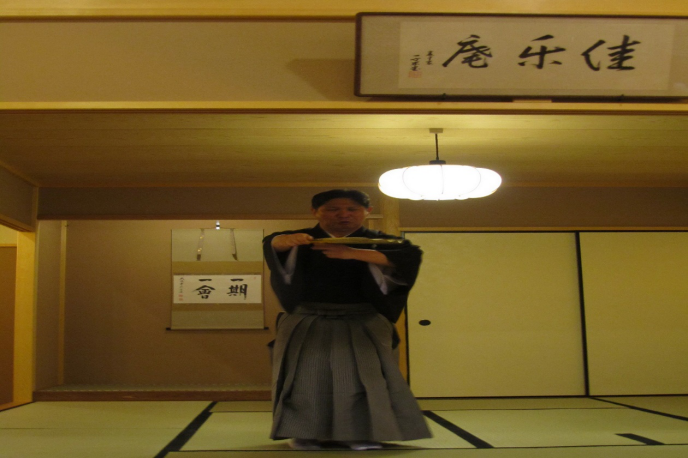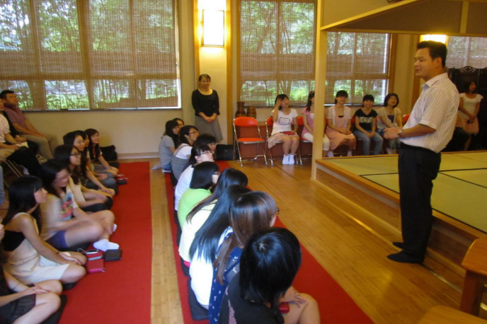 本网讯 6月1日下午,在佳乐庵茶室,日本能乐大师安田登先生用诙谐幽默的形式、通俗易懂的语言讲授了关于日本传统文化能乐的知识,并进行了别开生面的能乐表演。这是安田先生第二次到访公司。公司日语系主任张秀强以及40多名日语学子参加了此次活动。茶室负责人杜凡与里千家驻穗茶道讲师村内伦子筹备了此次活动。