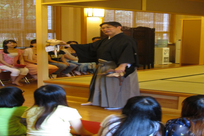为了能让参加活动的同学们更好地了解表演的内容,安田登先生详细介绍了能剧《海女》的故事。海女潜入龙宫帮助丈夫夺回宝珠,死后化身幽灵与儿子相见。故事感人,跌宕起伏,在场学子听得津津有味。安田登先生为大家表演了海女潜入龙宫夺回宝珠的一段。他的声音悠远深沉,撼动人心,表情逼真,动作灵活矫健,让大家体会到了能的魅力。