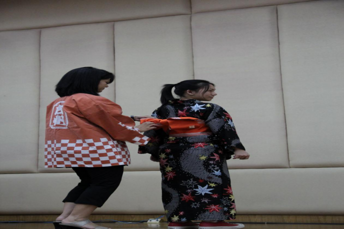 一曲完毕,舞台上开始展示浴衣(夏季单和服)的穿着方法,虽然是用日语解说,但非日语专业的同学仍旧兴致勃勃,认真地听着,担任模特的同学不时做出搞怪的动作表情,引得全场笑声连连。
