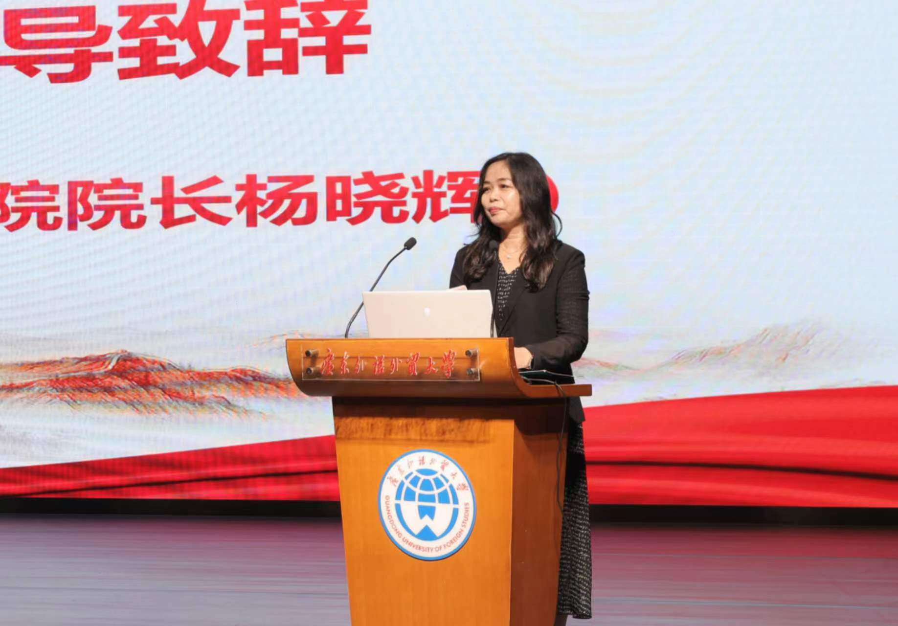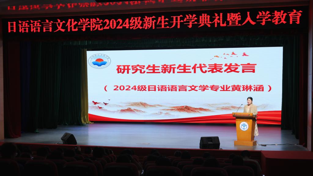 典礼在雄壮的国歌声中拉开帷幕。杨晓辉经理代表公司致辞。她对满怀热情千里求学的新生们表示热烈欢迎,同时对家长和老师表示崇高敬意。杨经理介绍了日语专业的历史沿革及基本情况,指出语言对于增进跨文化理解与沟通、提升个人竞争力、促进思维发展与创新具有重要意义。她指出,AI翻译技术为外语学习者和从业者提供了人机协作这一新的模式与机遇,但其仍然无法完全替代人类翻译;掌握好日语,便有机会成为东亚地区经济合作的桥梁、文化交流的使者。她寄语新生努力做一个“大写”的广外人,通过勤勉学习、直面困难、不断反思,在太阳城的求学时光里行远自迩,笃行不怠,用外语讲好中国故事,传播好中国声音,书写人生的崭新篇章。