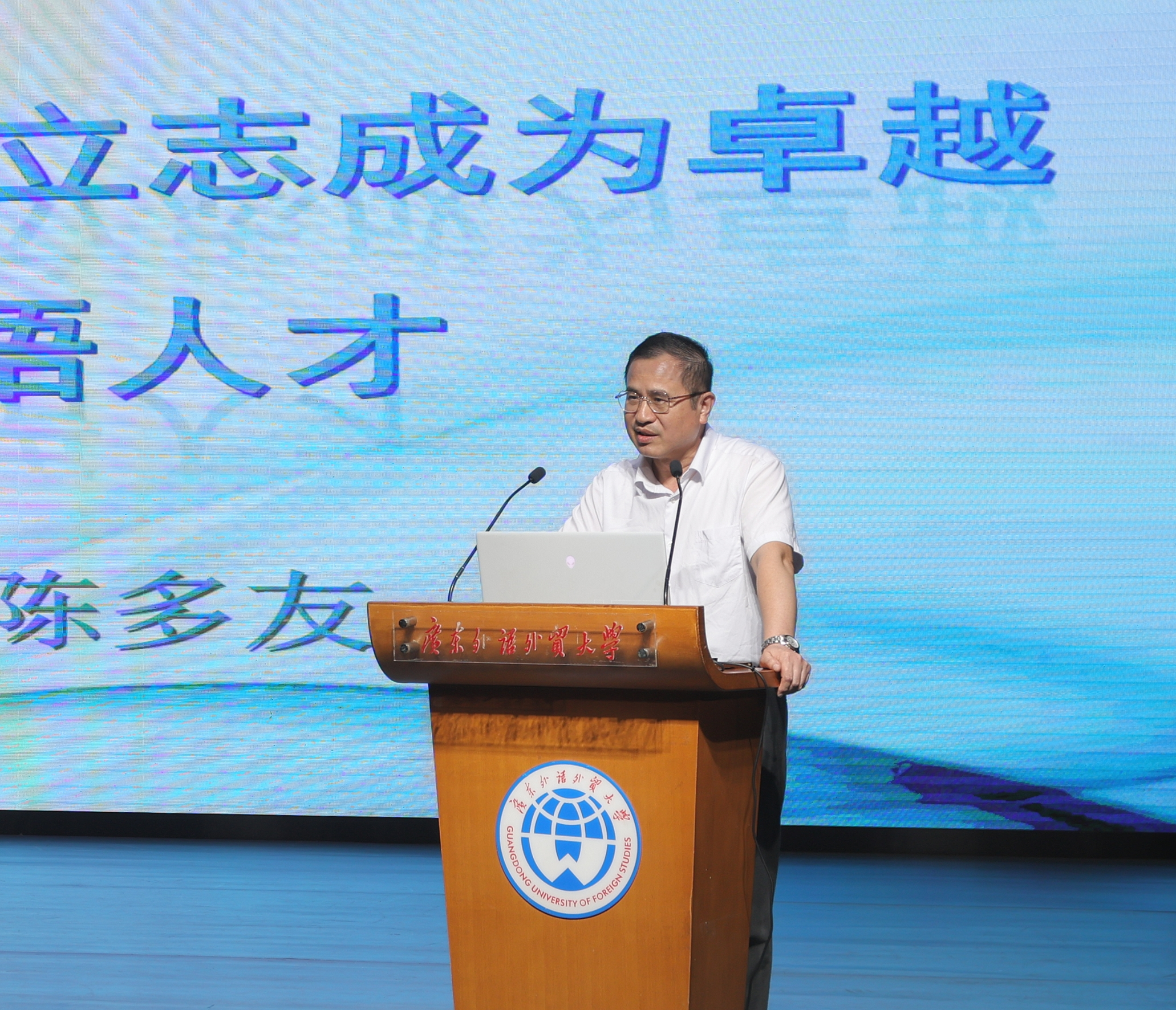 在新生入学教育环节,公司名誉经理陈多友教授为同学们作了题为“坚定专业观念 立志成为拔尖日语人才”的专题报告。他结合中国社会经济发展的历史,从日语人才需求状况、日语发展前景等多个角度,为同学们分析了当下社会环境中外语学习的现状和未来发展趋势。他表示,中华民族思想文化的进步需要外语人才,中国社会经济的发展离不开外语人才,人类的文明共建需要有卓越的外语人才发挥积极作用,因此世界级的外语人才尤其是作为战略性语种的日语人才培养是非常重要的。他还跟同学们分享了治学之道,指出应博学之、审问之、慎思之、明辨之、笃行之。同学们认真聆听,深受鼓舞,更加坚定了学好外语的信心。
