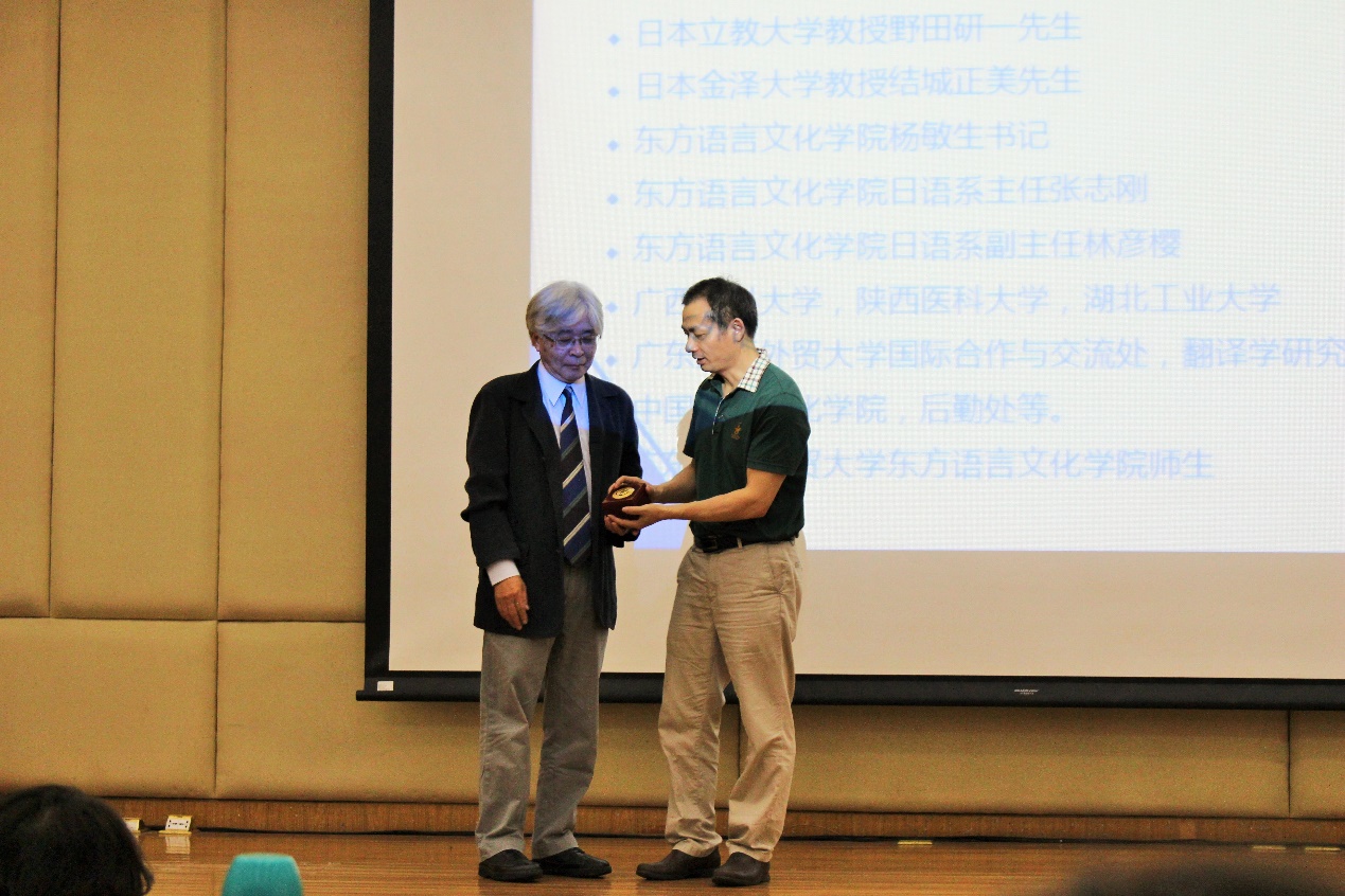 出席本次论坛的有日本文学环境学会会长、日本金泽大学教授结城正美、公司东语公司党委书记杨敏生、日语系主任张志刚,日语系副主任林彦樱,以及来自广东医药大学、山西科技大学、湖北工业大学等省内外高校和公司东语公司、国际交流与合作处、翻译学研究中心、中国语言文化公司、后勤处等相关公司和职能部门的师生。本次论坛由公司云山学者、中日比较生态文学研究所所长杨晓辉教授主持,她首先致欢迎词,紧接着杨敏生书记代表公司向野田研一教授赠送了纪念品。