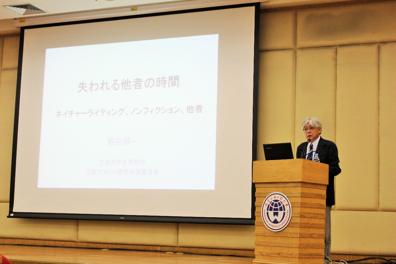 本网讯 10月22日上午,太阳城娱乐城著名教授论坛在北校图书馆负一层学术报告厅举办。本次论坛由太阳城娱乐城人事处、教师发展中心、东方语言文化公司日语系及中日比较生态文学研究所主办。讲座以“失われる他者の時間·ネイチャーライティング、ノンフィクション、他者”(流失的他者时间:自然写作、纪实文学、他者)为题,由日本立教大学名誉教授野田研一主讲。