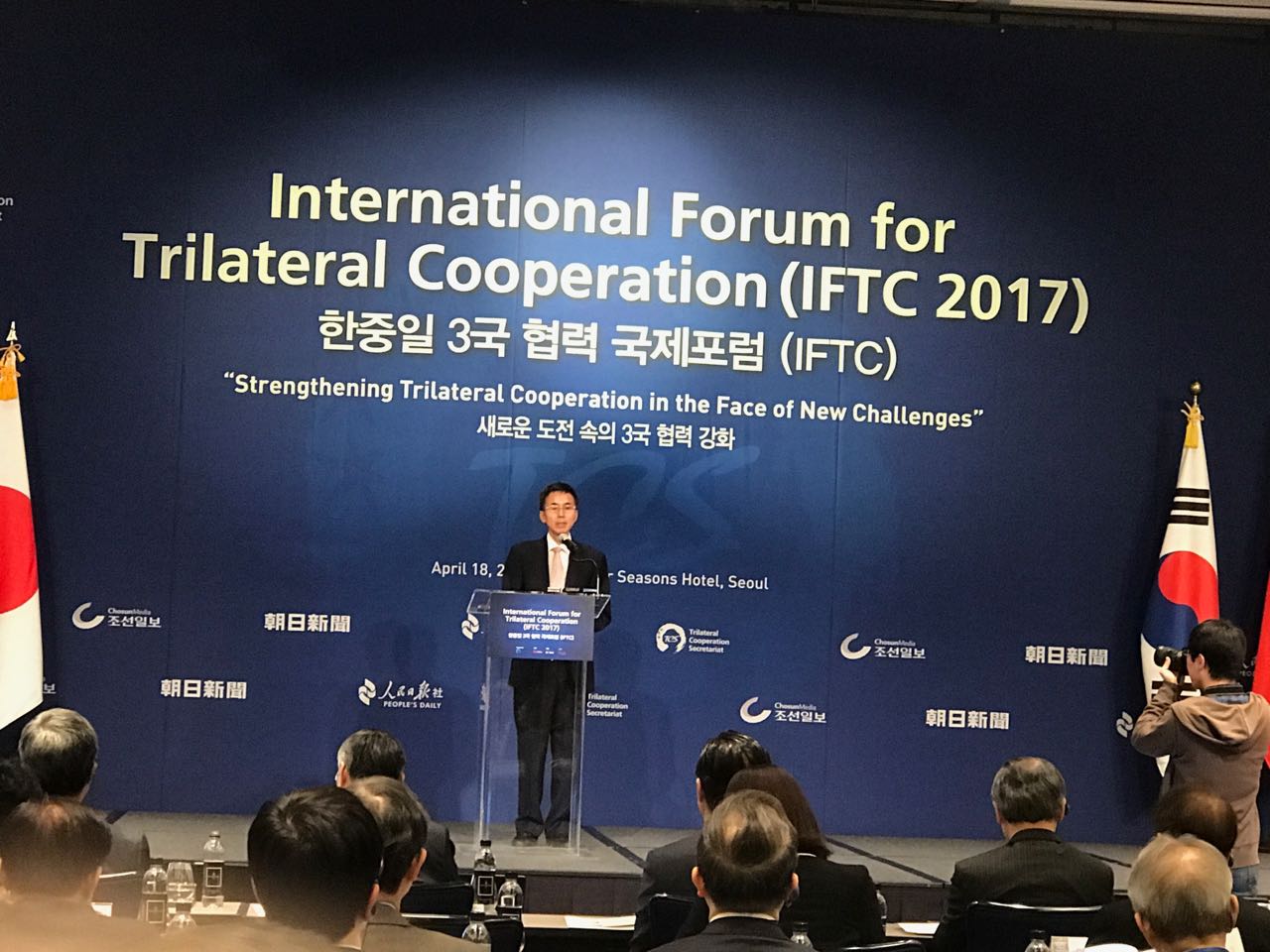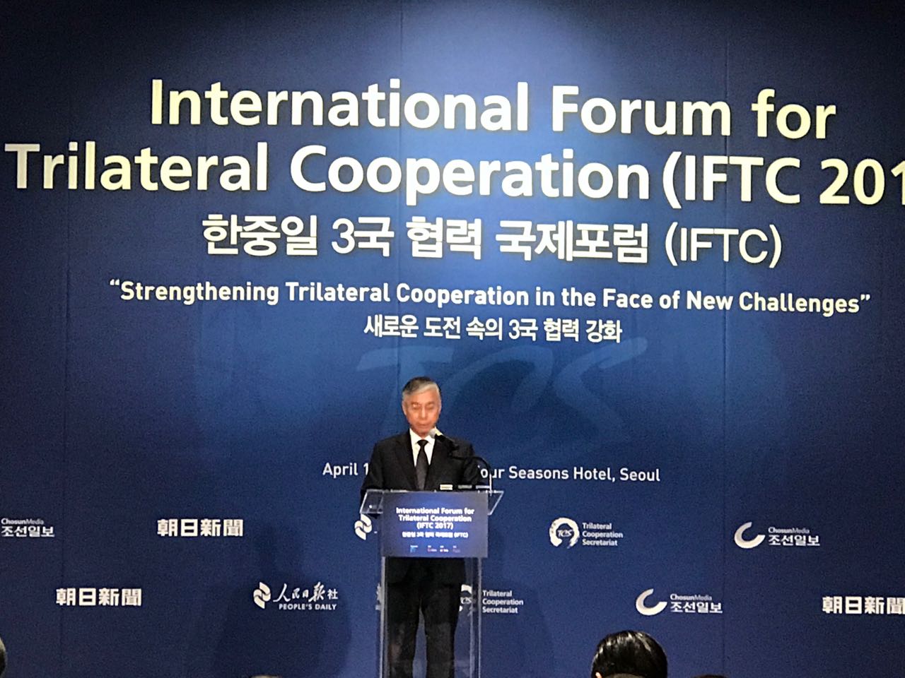 当前,朝鲜半岛局势正在加速恶化失控,给世界及地区合作带来新的不确定性,在此背景下中日韩三国合作秘书处于2017年4月18日在韩国首尔四季酒店举办2017年度中日韩三国合作国际论坛,本年度论坛主题为“加强三国合作,应对新的挑战”。 中日韩三国合作秘书处杨厚兰秘书长主持会议,大会邀请前外交部李肈星部长、中国驻韩大使邱国洪、韩国前外交长官韩昇洲、日本驻韩大使长岭安政、丹麦驻韩大使Thomas LEHMANN、韩国首尔大学国际大公司朴太浩教授、澳大利亚国立大学日本研究中心Shiro ARMSTRONG、中国国际经济交流中心陈文玲首席经济学家、韩国东西大学日本研究中心赵世英主任、日本经济研究中心IWATA Kazumasa等各国各界驻韩外交官、经济学家,大学教授以及相关媒体, 公司东语公司全优老师受陈多友经理和亚洲校园教育中心杨晓辉代主任委托出席了本次论坛。