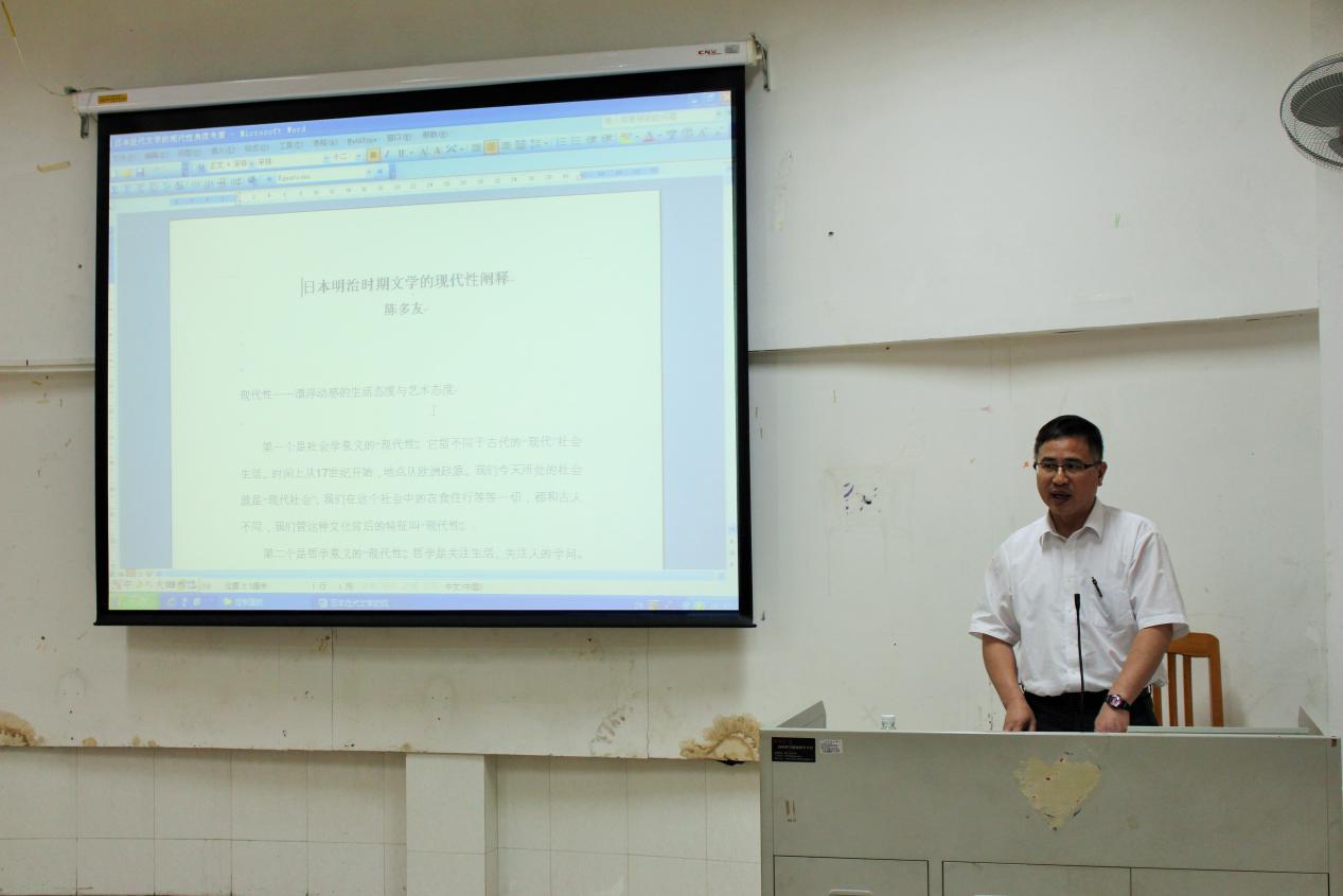 最后,陈多友教授以《日本近代文学的现代性角度考察》为题为我们带来精彩讲解。陈教授从社会学和哲学两个角度分析“现代性”一词意义,解释了“普遍主义”和“工具理性”这两条代表性的现代性特征,总结了日本的“现代性”萌芽和发展的表现,并强调了其现代性两级折中的倾向。陈教授还以明治初期著名作家夏目漱石等为例,探讨了日本文学的近代性扭曲特点,并指出了日本明治时代文学研究的新路径。