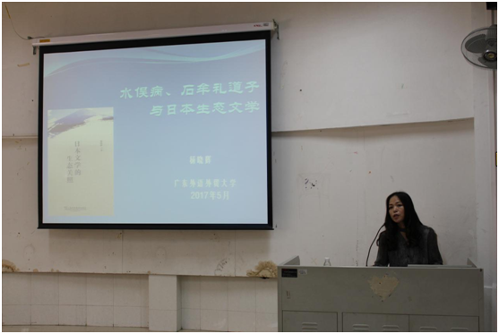 随后,杨晓辉教授以《水俣病、石牟礼道子与日本生态文学》为题,介绍了生态角度的跨学科比较文学研究。近代以来,由于工业与农业技术的快速发展,其引起的环境恶化导致日本爆发了一系列公害问题,其中就包括水俣病。杨教授对石牟礼道子所著的、被评为“日本战后文学最大杰作”的《苦海净土》作了精彩评析,引导我们从作者的成长环境背景探究其写作目的,从方言与话语权力的角度感受作者捍卫净土和坚守“话语权利”的强烈愿望,从意象的建构分析该作品的语言魅力与文学特色,向我们论述了生态文学研究重的大价值与意义。