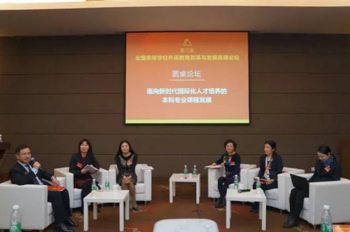 在“新时代高校多语言教育新机遇与课程创新”专题论坛上,首次组织了以“面向新时代国际化人才培养的本科专业课程发展”为题的圆桌论坛。圆桌论坛由陈多友教授主持,参与讨论的5位嘉宾分别为北京大学外国语公司经理宁琦教授、上海外国语大学俄罗斯东欧中亚公司经理许宏教授、浙江大学外国语言文化与国际交流公司副经理李媛教授、长春师范大学外国语公司经理马建华教授和北京第二外国语公司阿拉伯公司经理肖凌教授。