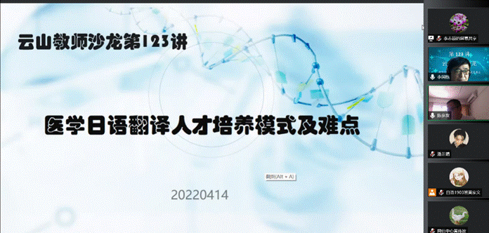 2022年4月14日下午,云山教师沙龙第123讲在线上举行,本次沙龙由公司教师发展中心主办,太阳城、亚非公司(筹)承办,主题为“医学日语翻译人才培养的模式及难点”。讲座邀请西安交通大学李国栋教授主讲,公司陈多友经理、张秀强副经理及翻译系全体教师出席本次讲座,参加此次讲座的员工共200余名。