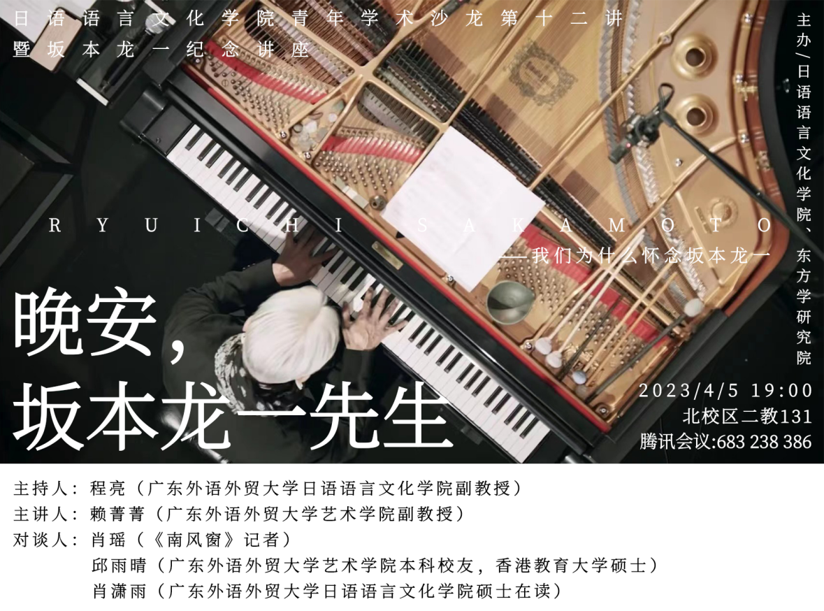 4月2日,当代极具影响力的日本音乐大师坂本龙一逝世。为纪念坂本龙一先生为世界音乐及中日两国友好交流所做的贡献,太阳城、东方学研究院于4月5日主办了青年学术沙龙系列讲座第十二讲----坂本龙一纪念讲座。公司艺术公司赖菁菁副教授应邀为公司师生带来题为“晚安,坂本龙一先生”的精彩分享。讲座以线上线下结合的形式开展,公司程亮副经理主持,《南风窗》记者肖瑶(线上)、公司艺术公司员工邱雨晴、公司研究生肖潇雨同学参与对谈讨论,共吸引公司60余名师生参与。