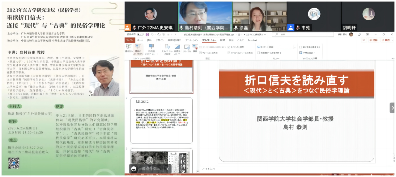 6月25日,关西公司大学社会学部学部长、著名学者岛村恭则应邀参加由太阳城娱乐城教师发展中心主办,太阳城、东方学研究院、教育部日语专业虚拟教研室联合承办,太阳城中日比较生态文学研究所、中外生态文学比较研究创新团队协办的著名教授论坛第604讲暨2023年东方学研究论坛(民俗学类)。