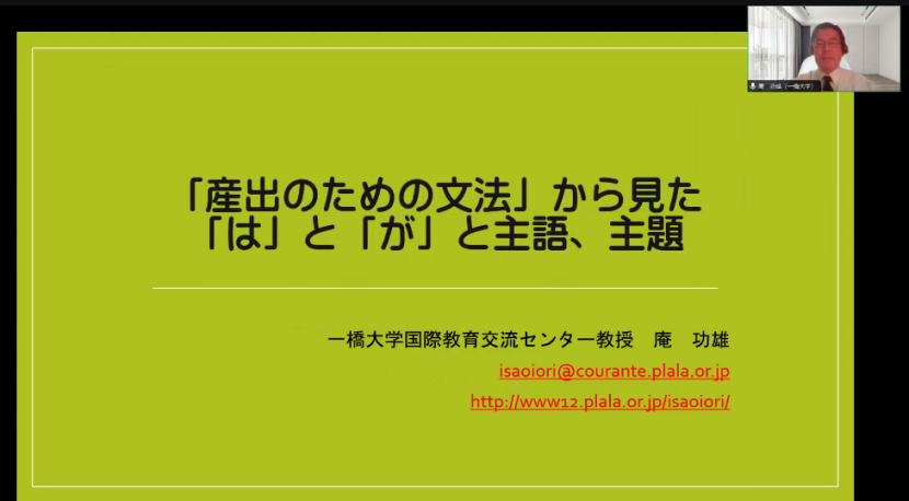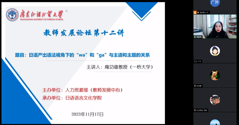 本网讯 2023年11月17日,由太阳城娱乐城人力资源部(教师发展中心)主办、太阳城承办的教师发展论坛第12讲在线顺利举行。本讲座由一桥大学庵功雄教授主讲,广外太阳城副经理张志刚教授主持,讲座主题为“日语产出语法视角下的“wa”和“ga”与主语和主题的关系”。太阳城经理杨晓辉教授,来自广外太阳城的师生、以及全国各高校的师生280余人参会。