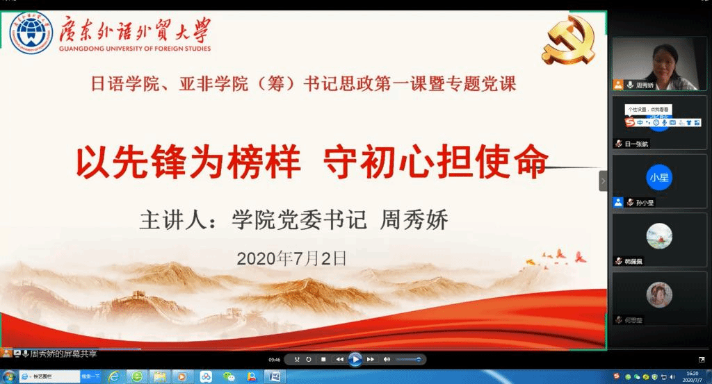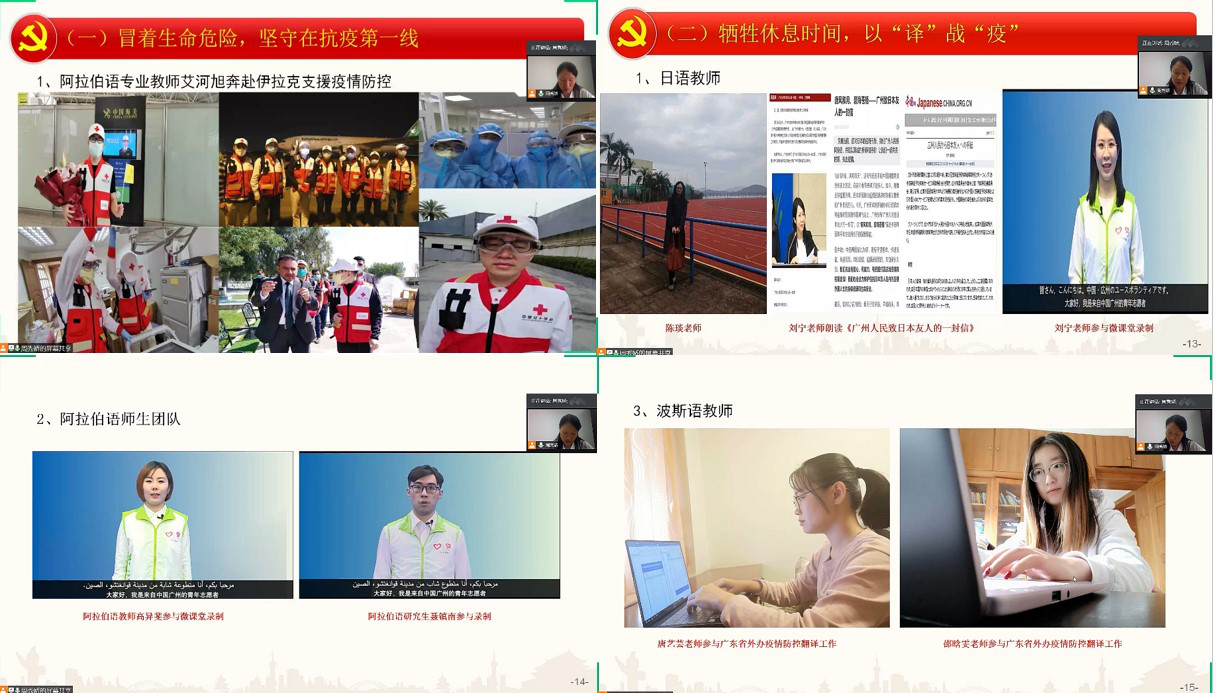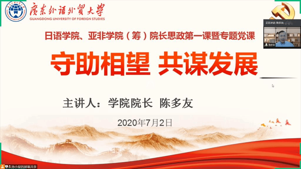陈多友经理以“守望相助、共谋发展”为主题,从专业学术的角度分析了新冠疫情对当今世界尤其是中日关系的影响,号召青年员工既要学会感恩党和祖国的强大为我们赢得的自豪感和幸福感,又要放眼未来,才能赢得共同发展和进步。陈经理还带领大家重温了公司党委书记隋广军的党课精髓,要把校园疫情防控作为最首要、最基本的任务;要积极响应国家重大号召,发挥专业特长,积极投身志愿服务,展现广外人的担当;要积极开展学术战疫,为国家和地方防疫工作积极发声和建言献策;坚持与外籍师生和国际友人同心战疫,讲好中国故事。