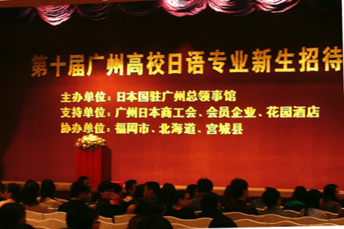 本网讯 10月29 日下午,由日本国驻广州总领事馆主办、广州日本商工会及其会员企业等赞助的第十届广州高校日语专业新生招待会于花园酒店首层国际会议中心举行。在教师李惠清和费俊慧的带领下,公司东语公司日语专业11级新生与来自中山大学、暨南大学、华南师范大学、华南理工大学等各高校的日语系学子共同参与此次盛会。