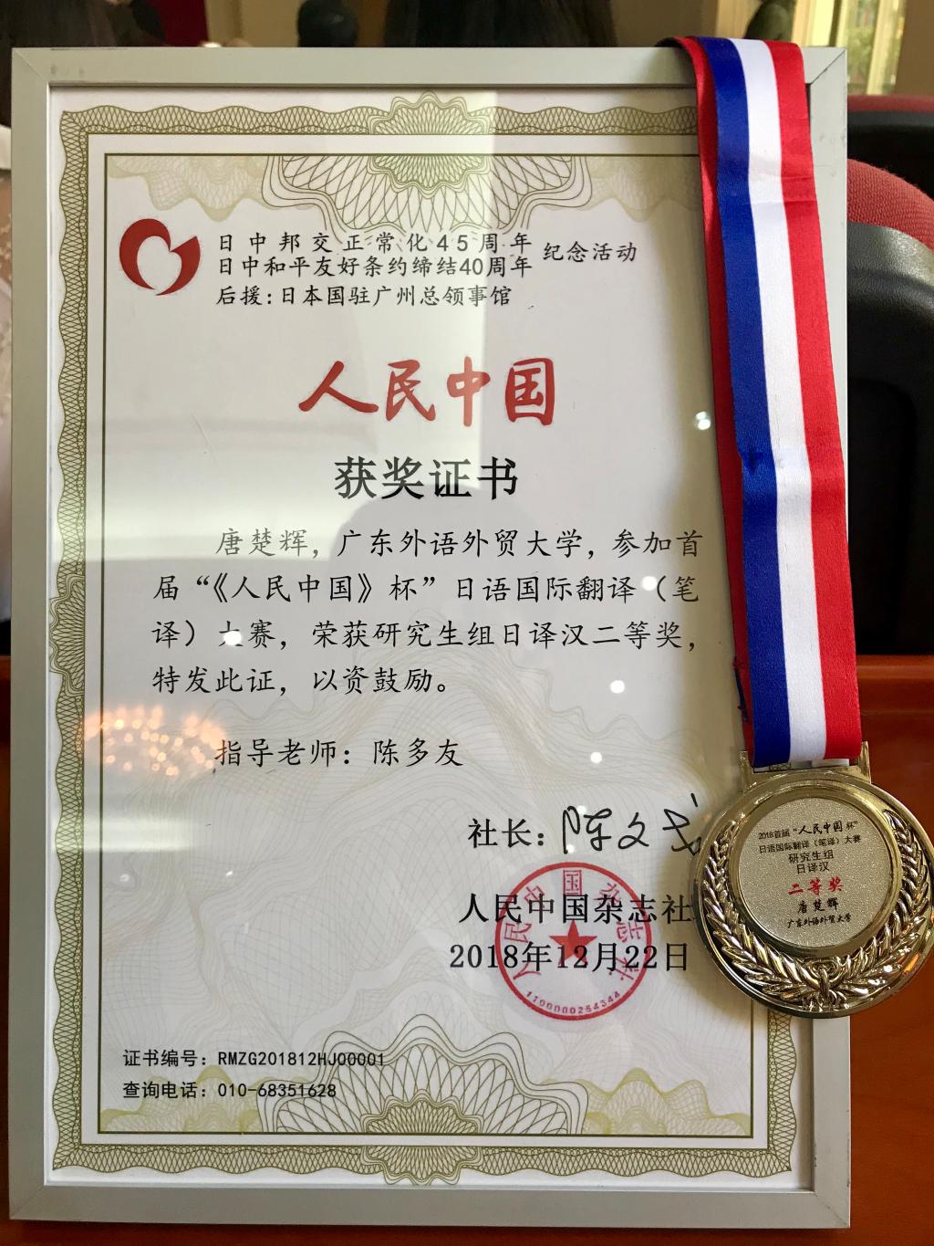本网讯 2018年广东省翻译协会2018年会——医学翻译高端论坛暨首届颁奖典礼在南方医科大学举行。公司2018届日语语言文学研究生(2018年6月毕业)唐楚辉同学荣获本次大赛(研究生组)日译汉二等奖,其指导教师陈多友教授荣获优秀指导教师奖。