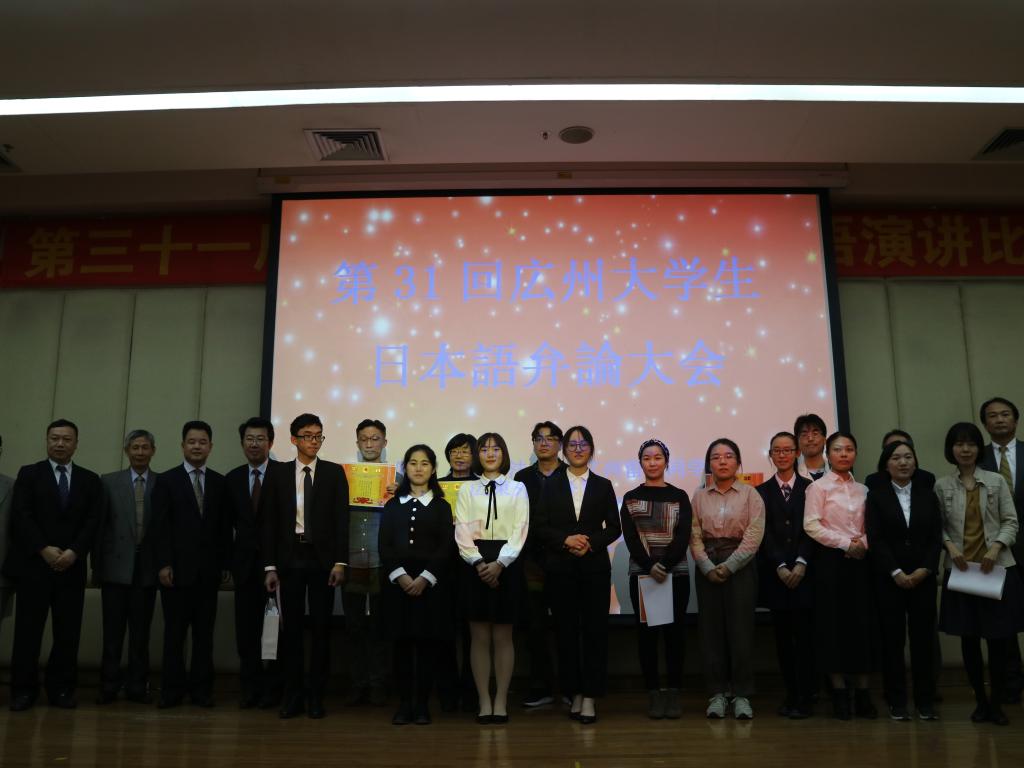 本网讯 2018年12月22日上午,第三十一届“广州老员工日语演讲比赛”于图书馆负一楼报告厅圆满结束。本次比赛由中国日语教学研究会华南分会、广州留东同学会主办,由广外太阳城、亚非公司(筹)承办。来自广州市11所公立大学的共23名选手参加了本次比赛。来自本校太阳城、亚非公司(筹)17级的黄畅同学以优异成绩并列演讲成绩第2名,并通过加时赛最终获得一等奖。另外两位同样来自太阳城、亚非公司(筹)17级的王子健、王丽杰同学也以优秀的表现获得了优秀奖。
